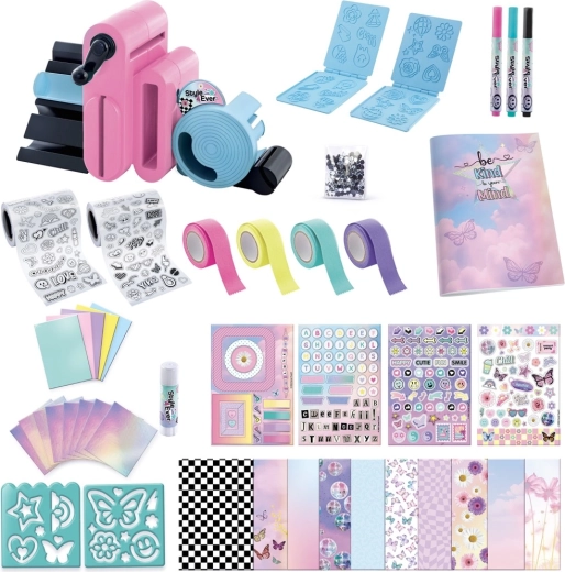 De set bevat meer dan 150 accessoires: vellen papier, zwart-witte en gekleurde stickers, stiften, glitterlijm, decoratieve tapes en themasjablonen met motieven zoals bloemen, vlinders, sterren en teksten als “Be Happy” of “Cool”. In de verpakking vind je ook een klein notitieboekje om je nieuwe creaties direct te gebruiken.
