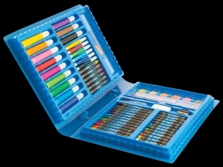 - kunststof koffer, waterverf, stiften, waskrijtjes, kleurpotloden, puntenslijper, gum