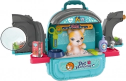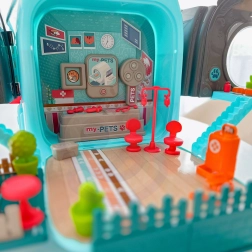 De set bevat een doktersfiguur, hondenmaatjes, meubels en kliniekuitrusting en medische instrumenten (stethoscoop, spuit enz.), verder een kam, schaar en andere verzorgingsaccessoires. Het geheel is licht, compact en eenvoudig mee te nemen – ideaal voor op reis en in de kinderkamer.