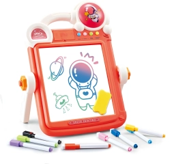 De tekenzijde biedt een schone, droog uitwisbare oppervlakte, 8 gekleurde stiften, een spons en 18 dubbelzijdige kaarten voor herhaald tekenen en schrijven.