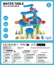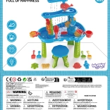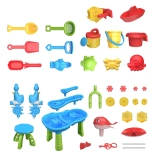 Inhoud van de set: 2× emmer, 1× gieter, 5× vormpje, 1× eenvoudig molentje, 5× zandgereedschappen (bijv. schep, hark, zeef), water-/zandtafel met montagematerialen, 1× stoeltje.
