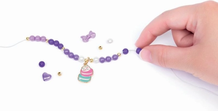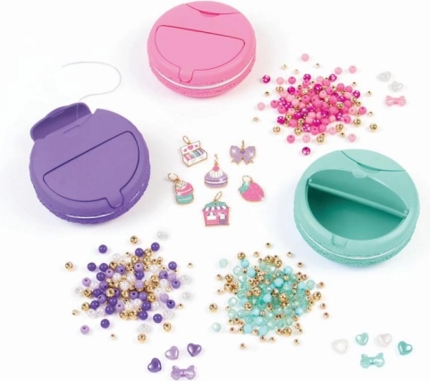 Ontdek de zoete wereld van creativiteit met de set Macaron box voor het maken van armbanden. Elke kleurrijke macaron bevat kralen, bedels en koordjes die je alleen maar hoeft te rijgen om originele armbanden met dessertmotieven te maken. Dankzij de slimme verpakking kun je eenvoudig meten en afknippen door het koord rond de omtrek van de macaron te wikkelen.