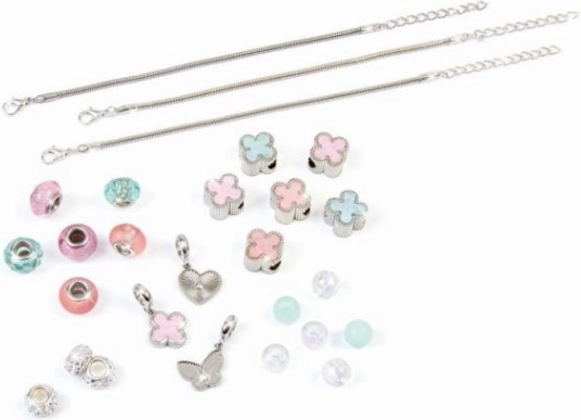 Ontdek de vreugde van DIY-sieraden en ontwerp drie originele armbanden naar eigen fantasie. Combineer zachte pastelkralen, glinsterende elementen en schattige motieven zoals hartjes, bloemen en vlinders. Het makkelijke sluitwerk en verwisselbare hangers laten je stijl snel aanpassen aan je humeur en outfit.