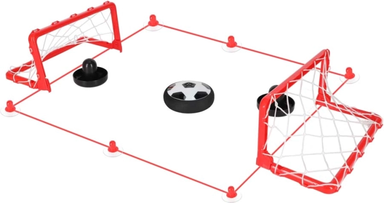 De set bevat twee lichte doelen, twee pucks met vilten onderzijde en een set zuignappen met koord om snel het speelveld op elke tafel af te bakenen. De regels zijn eenvoudig: markeer het veld, ga achter je doel staan, zet de bal aan en schiet doelpunten bij je tegenstander.