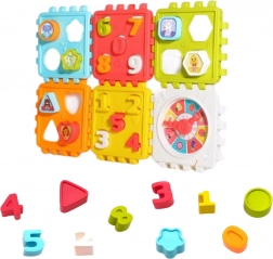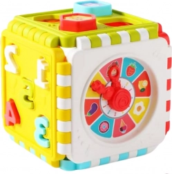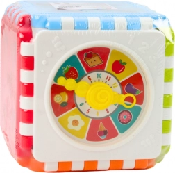 Elke zijde van de kubus biedt een spannende taak: klokken, cijfers en vormen samen met afbeeldingen voor zintuiglijke ontwikkeling.