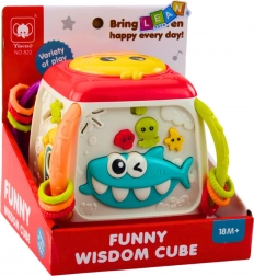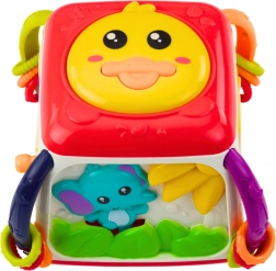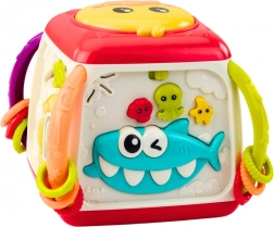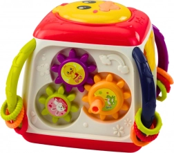 De kubus bevat interactieve elementen zoals muzikale knoppen en draaibare tandwielen die het kind urenlang plezier en stimulatie bieden.