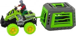 De set bevat niet alleen een robuuste quad met een aankoppelbare kooi, maar ook een figuur van een bestuurder met beschermende helm en een dinosaurusfiguur, die samen een consistent speelscenario vormen dat direct na het uitpakken klaar is voor gebruik.
