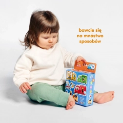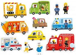 Een leuke set eerste puzzels voor de allerkleinsten: 8 tweedelige afbeeldingen van kleurrijke voertuigen en 4 figuurtjes voor nog meer speelplezier. Ontwikkelt de fijne motoriek, traint de aandacht en leert nieuwe woorden in één spel. Traditionele puzzelverbindingen maken de eerste stappen makkelijk en de voltooide afbeeldingen nodigen uit tot extra activiteiten.
