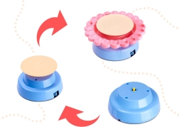 De set bevat een kleurrijke pottenbakkersschijf die speciaal is ontworpen voor het modelleren van klei en decoreren.