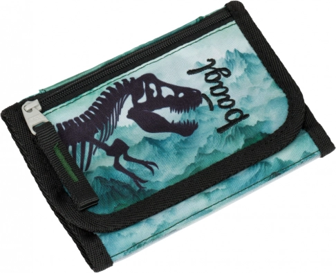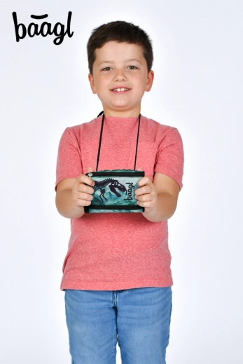 Stijlvolle kinderportemonnee van Baagl met dinosaurusmotief en draagmogelijkheid om de nek, met praktische indeling en veilig dragen. Dankzij de verstelbare koord met veiligheidssluiting, klittenbandsluiting en een apart vakje voor kleingeld is hij ideaal voor dagelijks gebruik naar school en clubjes. Gemaakt van duurzaam gerecycled materiaal.