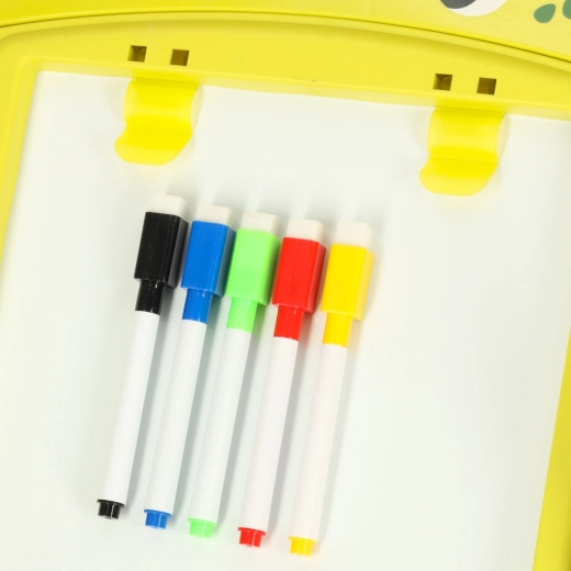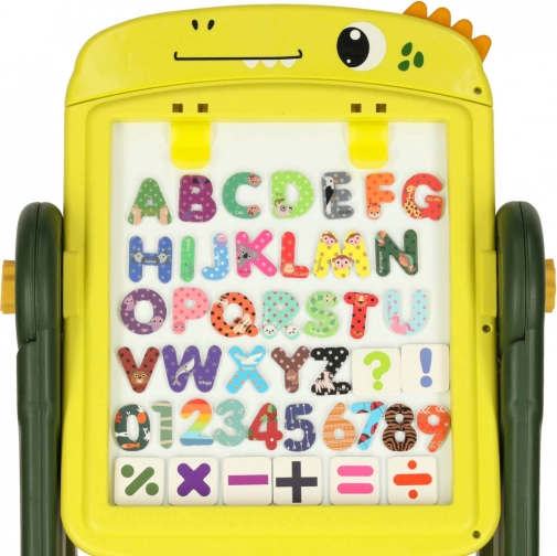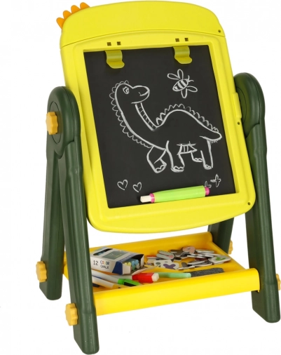 Dit dubbelzijdige educatieve bord is het ideale hulpmiddel om creativiteit en leren bij kinderen te stimuleren. Aan de ene kant bevindt zich een magnetisch wit oppervlak dat droog uitwisbaar tekenen en schrijven met stiften mogelijk maakt, terwijl de andere kant dient als klassiek zwart krijtbord. Versierd met een vrolijk dinosaurusmotief, zal dit bord ieder kind betoveren met zijn kleuren en gebruiksmogelijkheden.
