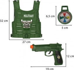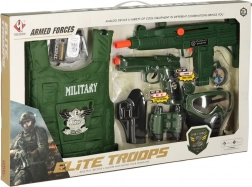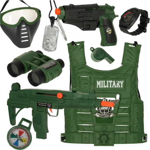 Deze militaire set is ideaal voor alle kleine liefhebbers van avontuur en militaire spellen. Met deze set kunnen kinderen spannende missies en avonturen beleven. Bevat: vest, verrekijker, geweer met mechanische herlaadfunctie, batterijgevoede pistool, siliconen horloge, oogmasker, kompas, echte fluit, militaire ID-tag en pistoolholster. Elk onderdeel is gemaakt van hoogwaardige materialen en biedt realistische details.