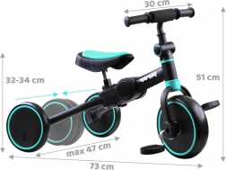Tiny Bike is een slimme oplossing voor de eerste ritten – één toestel, drie modi. Dankzij het eenvoudige omschakelsysteem zonder gereedschap pas je de fiets in enkele seconden aan de leeftijd en vaardigheden van het kind aan. De stevige maar lichte constructie maakt besturen en dragen eenvoudig, terwijl de brede wielen en het lage gewicht zorgen voor een veilige en stabiele rit.