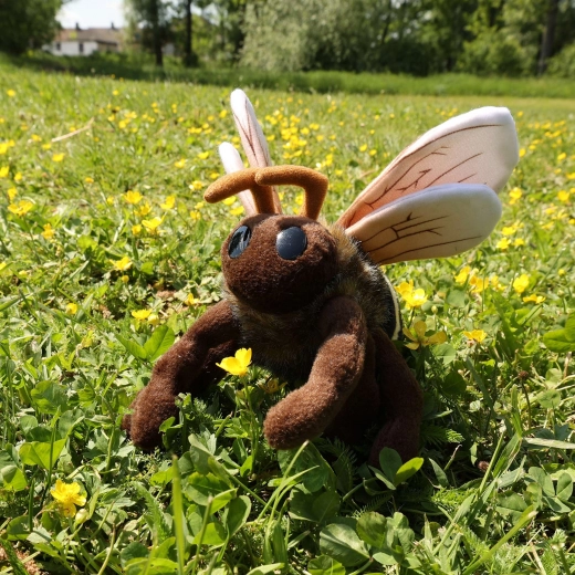 Fijne vleugels met adering, een gestreepte achterlijf en grote ogen geven het speeltje een levendige uitstraling waar kinderen dol op zijn.