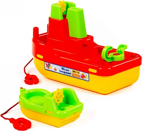De sleepboot is uitgerust met een haak en touw, waarmee kinderen eenvoudig het kleinere bootje kunnen aankoppelen en slepen – net als op echt water.