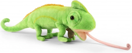 Deze gedetailleerd uitgewerkte pluche kameleon valt op door zijn realistische design, geborduurde details en superzachte oppervlakte die uitnodigt om te knuffelen. Dankzij het handmatige stikwerk en de hoogwaardige materialen oogt hij levensecht en past hij perfect in de kinderkamer of in een dierenverzameling.