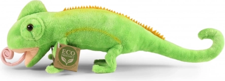 Geborduurde elementen, oranje rugstekels en een schattig roze tongetje maken van de kameleon een levensechte pluche vriend.