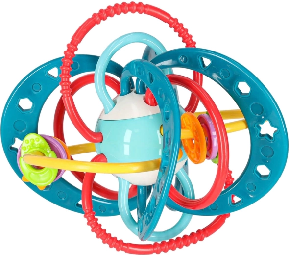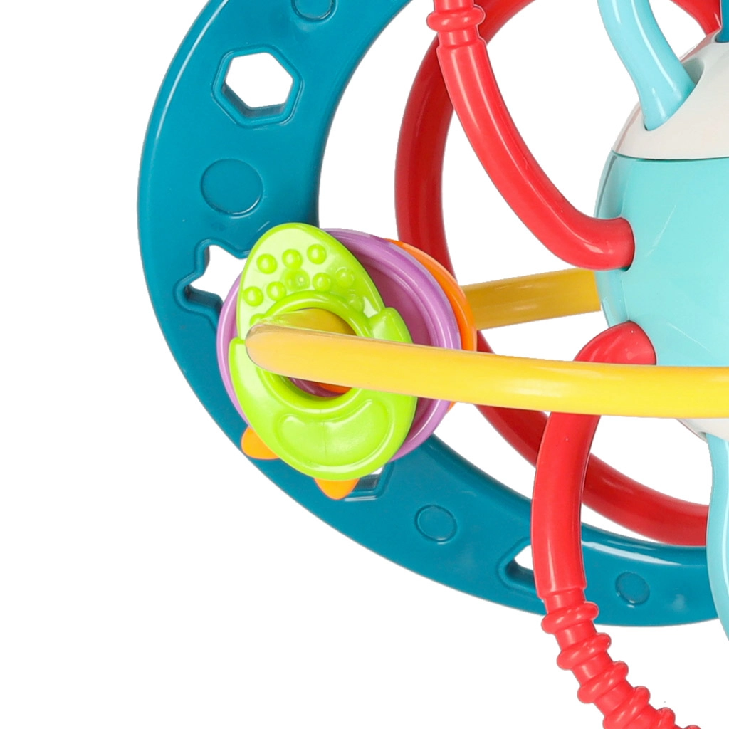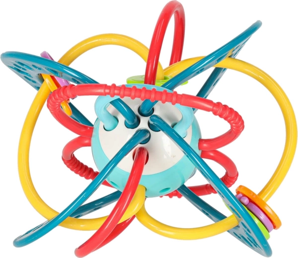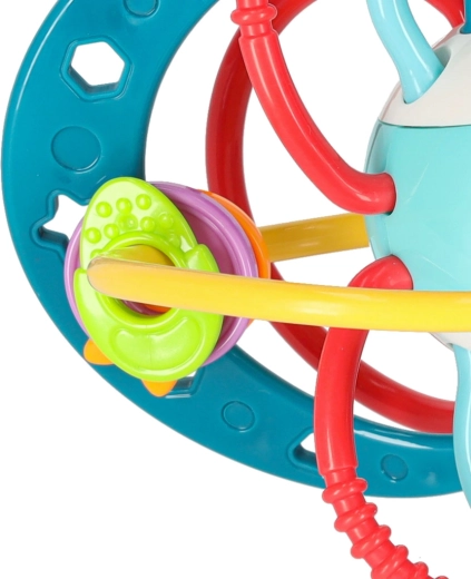 Kleurrijke sensorische bijtring met rammelaar nodigt baby’s uit om te grijpen, kauwen en schudden. Veelzijdige texturen verlichten bij doorkomende tandjes, versterken de fijne motoriek en stimuleren zicht en gehoor. Veilig ontwerp zonder scherpe randen, gemaakt van niet-giftige materialen.