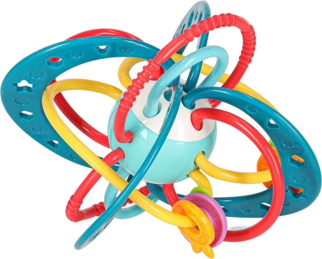 Deze turquoise bijtring–rammelaar is ontworpen voor de kleinste handjes. De verweven lussen en ringen liggen prettig in de hand, verschillende oppervlakken masseren het tandvlees en kleurrijke elementen trekken de aandacht. Door te schudden activeert je kindje een zachte rammel die de zintuiglijke ontwikkeling ondersteunt.