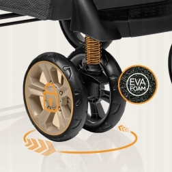 Zacht matras is bestand tegen slijtage en vuil, wat langdurig comfort en eenvoudig onderhoud verzekert. Veel opbergruimte aan de onderkant van de kinderwagen en een praktische tas zijn ideaal voor alle benodigdheden onderweg. De kinderwagen is uitgerust met geveerde wielen met rem, die een soepele en veilige rit garanderen.