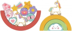Alle blokken zijn gemaakt van hout met FSC-certificering, wat een verantwoorde herkomst van de materialen garandeert. Het speelgoed biedt niet alleen plezier, maar stimuleert ook de fijne motoriek, wat kleine handjes helpt bij het leren stapelen van verschillende vormen.
