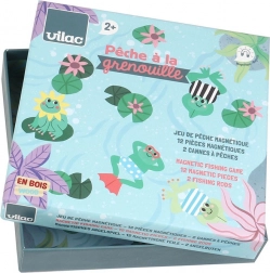 De verpakking bevat 12 houten magnetische kikkers, 2 houten hengels met magneet en 1 speeldoos/basis. Dit spel kan gespeeld worden vanaf 2 jaar en is ideaal voor 2 spelers.