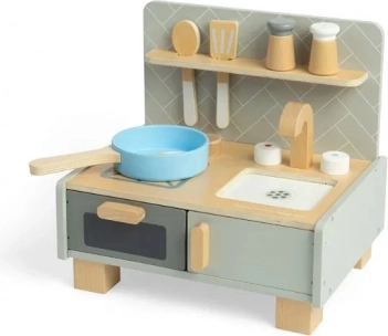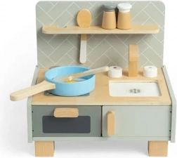 Het compacte design in zachte, neutrale kleuren past perfect in elke kinderkamer of speelruimte. Hij is gemaakt van FSC®-gecertificeerd hout en geverfd met niet-giftige verven, wat duurzame en veilige speelpret garandeert voor kinderen vanaf 3 jaar. Naast het plezier stimuleert deze kitchenette de ontwikkeling van fantasie en verbeeldingskracht, terwijl kinderen keukenrollen nadoen.