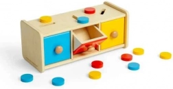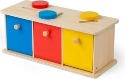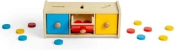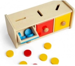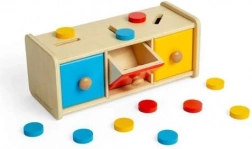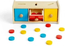 Deze prachtige sorteerdoos bevat 15 schijfjes in drie verschillende kleuren: geel, rood en blauw, die kinderen in de juiste openingen laten vallen. De set bevat ook een houten doos met drie laatjes. De sorteerdoos maakt deel uit van het Montessori-onderwijsprogramma, dat kinderen motiveert om al spelenderwijs te leren.