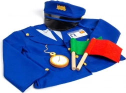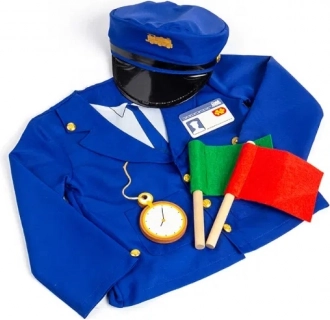 - Inhoud van de set: blauw gevoerd jasje, pet, zakhorloge, naamplaatje, 2 seinvlaggen (rood en groen)