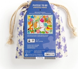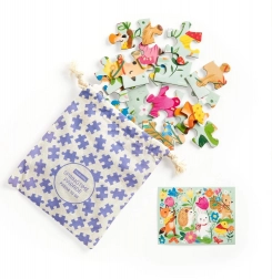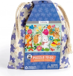 Schattige puzzel met kleurrijke illustraties van dieren in een lentestoet, bestaande uit 36 stukjes, verpakt in een handig 100% katoenen zakje voor onderweg.