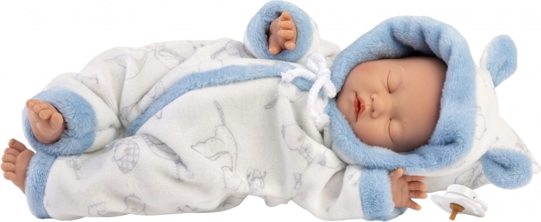 Realistische pop baby met een slapende expressie en een zacht stoffen lichaam, gemaakt van hoogwaardige zachte vinyl. Ideaal cadeau in een elegante geschenkdoos voor kinderen vanaf 3 jaar.