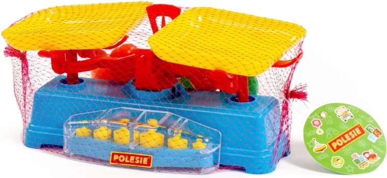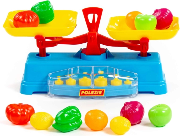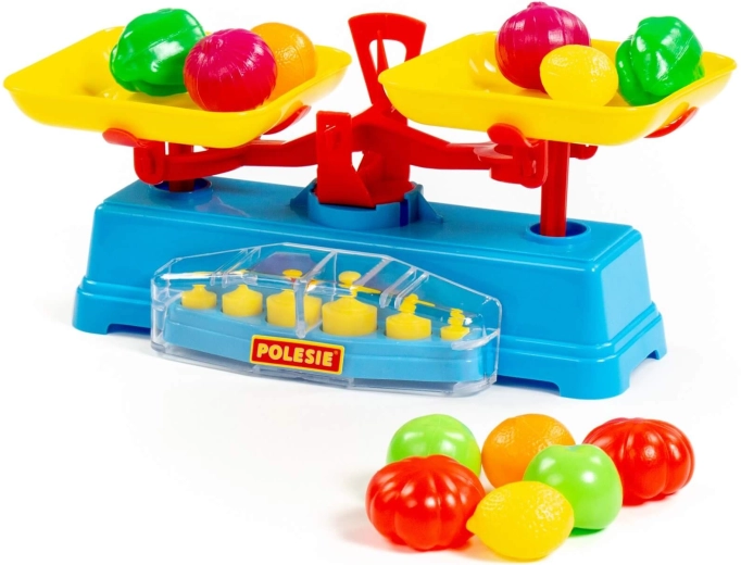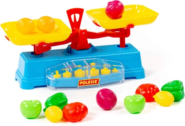 De speelset bevat een weegschaal, twee schaaltjes en 6 gewichten.