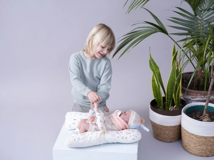 Dankzij de scharnierverbindingen zijn armen en benen beweeglijk. De baby is ook een geweldige speelkameraad dankzij de mogelijkheid om extra kleertjes uit het Llorens-assortiment bij te kopen voor maten 40-42 cm of 43-45 cm.
