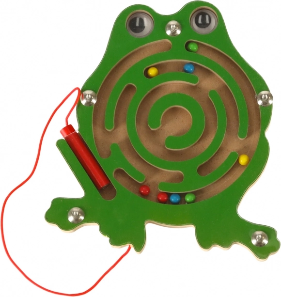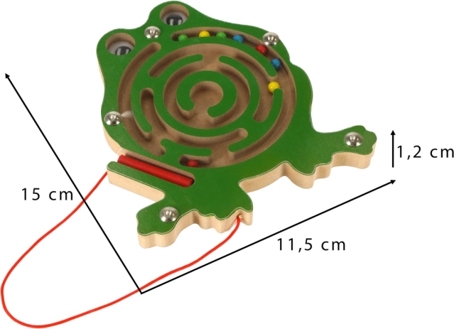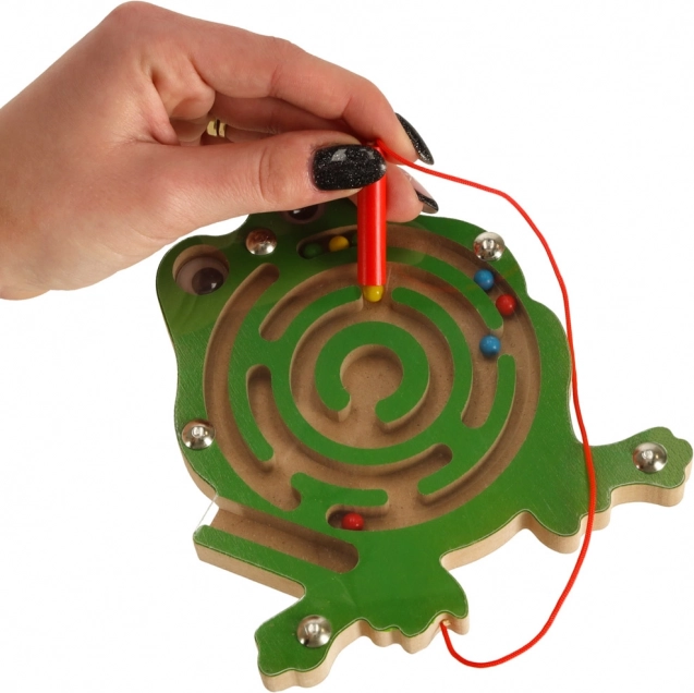 Dit houten magnetische doolhof in de vorm van een kikker houdt kinderen thuis en onderweg langdurig bezig. Met de meegeleverde magnetische pen aan een koordje leiden ze de gekleurde balletjes door de kronkelige banen naar de eindbestemming. De transparante afdekking zorgt ervoor dat de balletjes altijd binnen het speelgoed blijven.