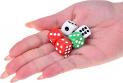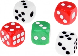 Dobbelstenen met contrasterende stippen en afgeronde hoeken voor prettig gooien en eenvoudig aflezen van de resultaten.