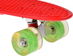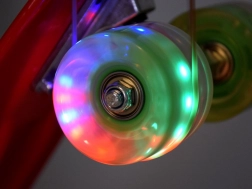 De wielen van duurzaam materiaal met rubberen laag zorgen voor uitstekende grip en trillingsdemping. Ingebouwde LED’s die tijdens het rijden branden geven het skateboard een unieke look en vergroten de zichtbaarheid van de gebruiker – zonder batterijen! De diodes worden aangedreven door magnetische energie die wordt opgewekt door het draaien van de wielen.