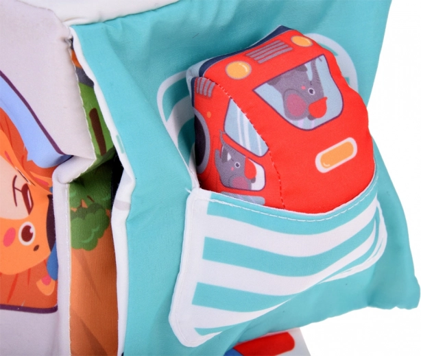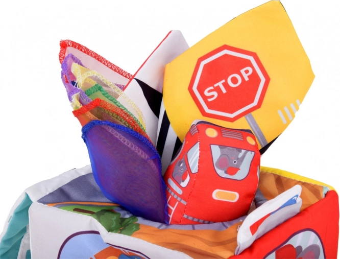 Ontdek de fascinerende wereld van spel met de Zachte sensorische kubus! Dit interactieve speelgoed boeit en betrekt het kind voortdurend en wordt een trouwe metgezel in verschillende ontwikkelingsfasen. Meer dan een gewone kubus – het is een hulpmiddel dat letterlijk met uw kind meegroeit. De rijkdom aan kleuren, de verscheidenheid aan vormen en de verborgen verrassingen trekken steeds weer de aandacht en moedigen aan tot verkennen. Het kind ontdekt nieuwe texturen, trekt gekleurde sjaaltjes en balletjes uit de kubus en leert de fascinerende wereld van voertuigen en verkeersborden kennen.