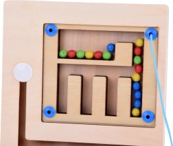 Het spel bevat gekleurde kogeltjes die kinderen met behulp van een magnetisch stokje verplaatsen, wat de fijne motoriek en coördinatie stimuleert.