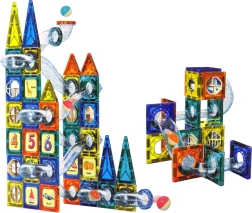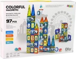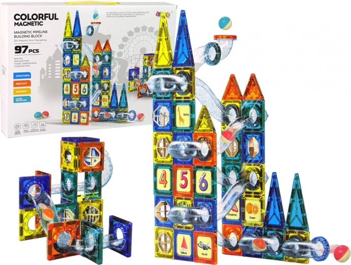 Magnetische blokken zijn een innovatieve bouwset die talloze mogelijkheden biedt voor creatief spel. De set bevat blokken in verschillende vormen in vier kleuren (oranje, geel, donkerblauw, groen) voor het bouwen van een kasteel en een knikkerbaan.