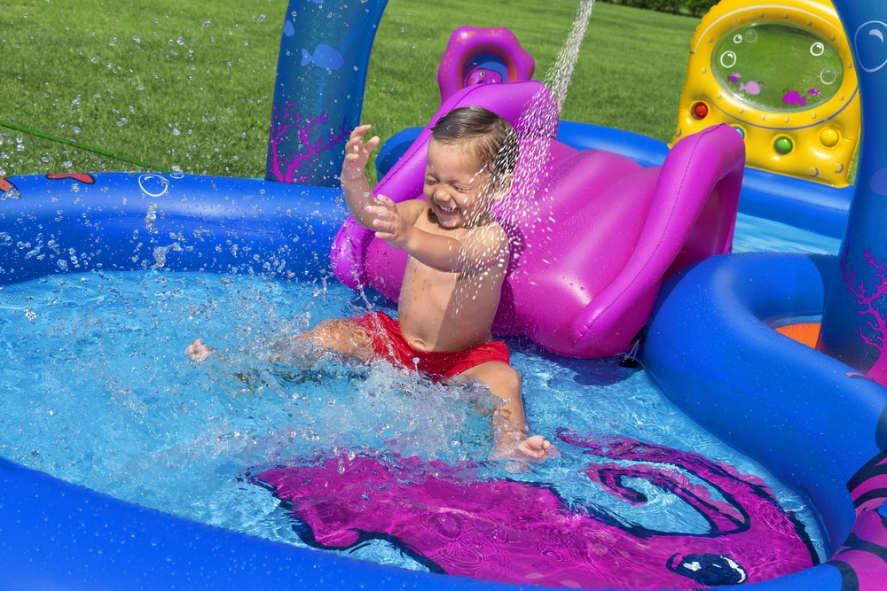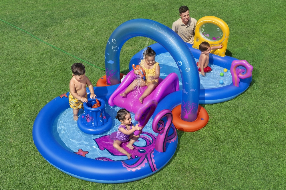 Verander je tuin in een levendig koraalrif, waar kinderen dappere ontdekkers van de diepte worden! Het Bestway water-speelcentrum Onderwaterwereld biedt een ruime opzet die onvergetelijke momenten vol waterpret garandeert.