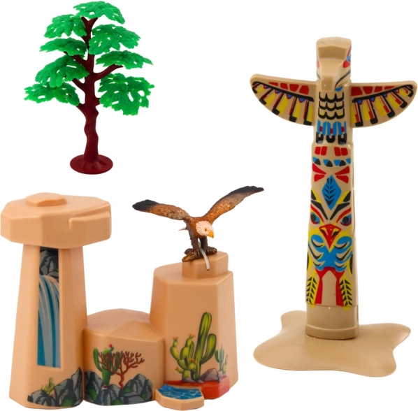 De set bevat een realistische kajak met plaats voor twee figuurtjes, een kleurige totem met traditionele patronen, rotsformaties, een boom en een reeks figuren waaronder twee indianen, een paard, een wolf, een adelaar en een slang. Alle onderdelen zijn zorgvuldig ontworpen van veilige en duurzame materialen.