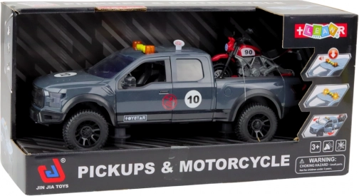 Groot model pickup met motorfiets is een speelgoed ontworpen voor de jongste autoliefhebbers. De pickup heeft te openen deuren en een achterklep, wat het laden van de motorfiets vergemakkelijkt en een authentieke uitstraling geeft. Kinderen kunnen reddingsmissies of offroadraces naspelen dankzij de mogelijkheid om de motorfiets op de laadbak te plaatsen en eraf te halen.