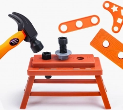 Alle onderdelen zijn gemaakt van duurzaam en veilig kunststof, zonder scherpe randen. De praktische koffer dient niet alleen als opbergruimte, maar ook als eenvoudige manier om de werkplaats mee te nemen, bijvoorbeeld naar de tuin of naar de grootouders.