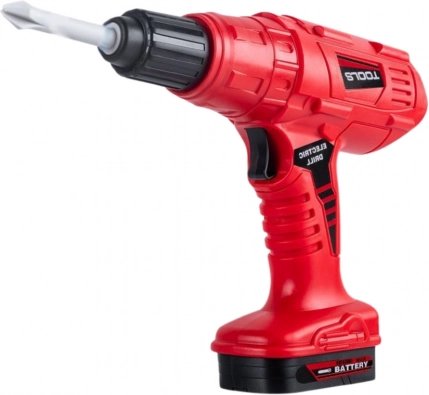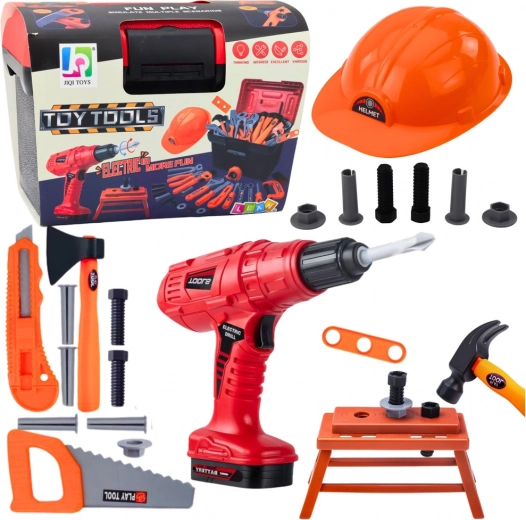De kinder-gereedschapsset laat kleine klussers veilig spelen met tools die eruitzien als echte. De elektrische boormachine op batterijen heeft verwisselbare bits – sleuf, kruiskop en boorbit. Daarnaast bevat de set ook een werkbankje en een beschermende helm voor nog meer realisme tijdens het spel.