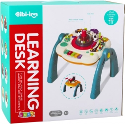 Aan de ene kant van de tafel bevindt zich een interactief educatief paneel met kleurrijke effecten die spel en ontdekking stimuleren. Het biedt geluids- en lichteffecten en bewegende elementen, zoals een kleurrijk pianootje, een trommeltje en draaibare wieltjes. Deze activiteit helpt zintuigen, fijne motoriek, oog-handcoördinatie en logisch denken te ontwikkelen.