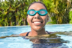 Duurzame polycarbonaat lenzen met UV-filter beschermen de ogen tegen schadelijke zonnestraling bij buitenzwembaden en aan zee.