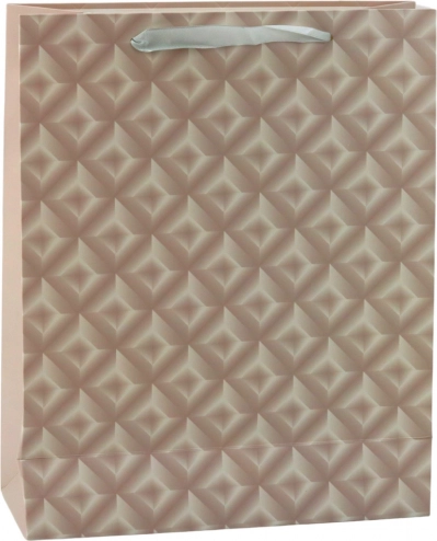 Deze cadeautas is gemaakt van hoogwaardig, verstevigd papier. Het oppervlak is versierd met een geometrisch reliëf dat het licht mooi weerkaatst. Voorzien van satijnen hengsels in een zachte tint, die zorgen voor comfortabel dragen en de tas een verfijnd karakter geven.
