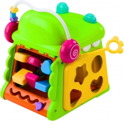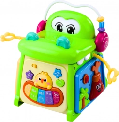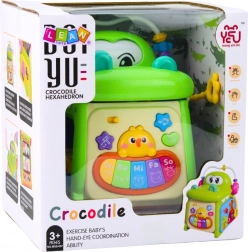 De interactieve krokodilkubus is uitgerust met een piano met gekleurde toetsen “Do, Re, Mi, Fa, So”, beweegbare onderdelen om te manipuleren en een klok met verstelbare wijzers. Elke zijde van de kubus biedt andere activiteiten, wat de aandacht van het kind langer vasthoudt. Dankzij de afgeronde randen en grote componenten is het speelgoed veilig en bevordert het de ontwikkeling van de handvaardigheid.
