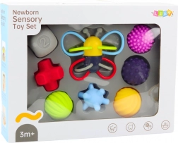 De set is ontwikkeld met het oog op de behoeften van de allerkleinsten, voor wie de wereld vooral uit zintuiglijke prikkels bestaat. Hij bevat verschillende kleurrijke elementen met duidelijke texturen, vormen en functies – allemaal ontworpen om tast, zicht en oog-handcoördinatie te stimuleren. De speeltjes helpen bij het leren grijpen, het ontdekken van nieuwe oppervlakken en vormen en ondersteunen de ontwikkeling van de fijne motoriek en sensorische integratie.