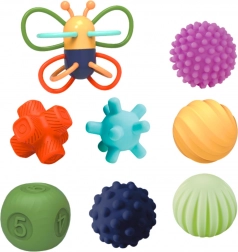 In de set vind je zachte ballen met uitsteeksels, flexibele bijtspeeltjes in interessante vormen, elementen om in te knijpen en ook een rammelaar met een lichte en praktische constructie, die het kind boeit door geluid en vorm. Alle onderdelen zijn gemaakt van hoogwaardige, niet-giftige materialen die veilig zijn voor kinderen – geschikt om op te kauwen, in te knijpen en met mond of handjes te verkennen. De oppervlakken zijn huidvriendelijk en de afmetingen van de elementen zijn ideaal afgestemd op kinderhandjes.